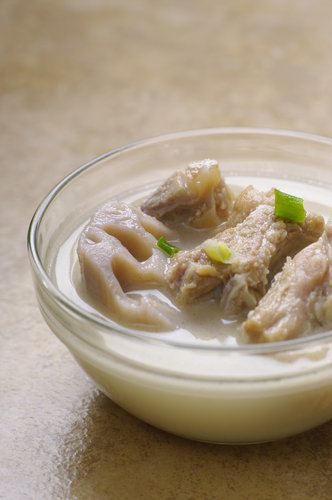 3)大概煲1小时左右排骨和黄豆芽就软烂,汤汁浓郁。这个时候关火把姜片拣去,放入盐和料酒,撒上葱段就可以喝了。