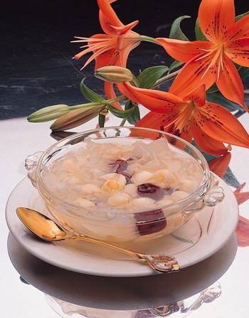 桂圆40克,松子仁20克,白糖适量。将桂圆去壳后洗净,松子仁洗净,两者共入锅中,加水适量,用中火烧开,改用文火煮10分钟,加白糖,过约10秒钟关火即成。