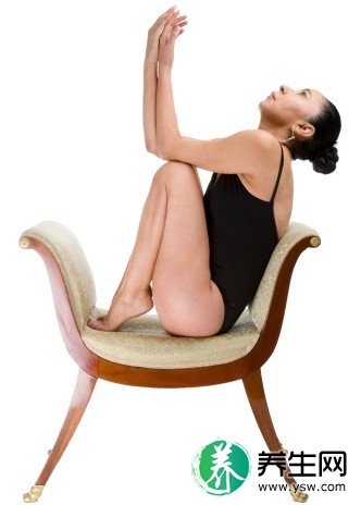 5、背对椅子约1步距离站立,双腿并拢。上身向左侧扭转,双手抓住椅背,目视椅子正前方,保持3-5个呼吸,然后回到原位,向右扭转。重复5次。