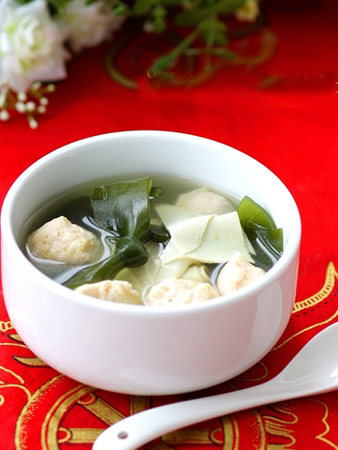 8.水开后,倒入海带和千张,稍煮调入少许盐即可。
