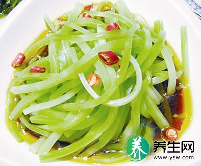 做法:1、将莴笋去皮洗净,切成6厘米长条状。2、己烧锅加水,待水开后,放入莴笋,大火滚开后关火。随即放入盛有冷水的容器中,过水后捞出放入盘中,撒少许盐、味精、水腌制,并摆放好葱丝待用。3、热锅下油至80度左右,放入适量花椒粒,煸至花椒变黑关火,捞出花椒粒,将油淋入摆放好的莴笋上即可。此道菜清淡、爽口,含锌约7、86毫克。莴笋所含矿物质比其他蔬菜高5倍,对儿童缺锌引起的消化不良、厌食等症有很好的疗效。