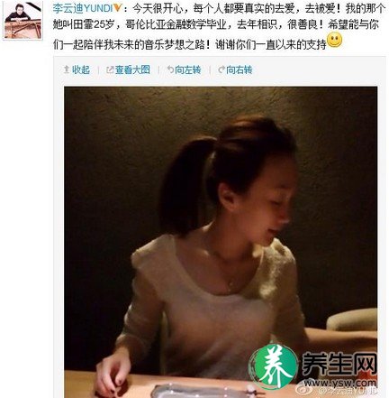王力宏公布恋情时,就有不少网友AT李云迪。没想到,11月27日深夜11点左右,李云迪发来大招儿,也分享了一张女孩照片。不过事实证明,李云迪这次发微博纯属手抖,约半个小时候,他终于捋清思绪,重发了该女孩照片,并附文:今天很开心,每个人都要真实的去爱,去被爱!我的那个她叫田霏25岁,哥伦比亚金融数学毕业,去年相识,很善良!希望能与你们一起陪伴我未来的音乐梦想之路!谢谢你们一直以来的支持。
