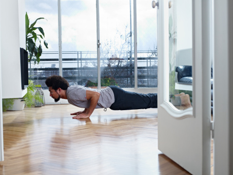 7、等肩宽俯卧撑。这个动作的方法规范同跪距式的一样,只是两手间的距离与肩宽相同。也是20个一组,做完一组后恢复30秒。