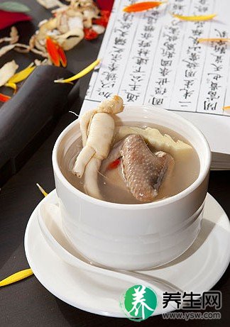 当归、党参、黄芪各10克,大枣10枚,生姜30克,乌骨母鸡1只,调料适量。将乌骨鸡去毛杂洗净切块,诸药布包,加清水适量,同炖至乌鸡烂熟后,去药包,葱、椒、盐、味精等调味服食。可补益气血,滋阴育精,适用于精气不足,每临即泄,心慌气短,肢软乏力等。