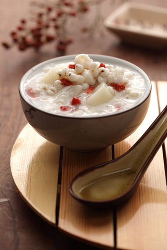 糯米300克,赤小豆,淮山药各50克,大枣20枚,莲子30克,白扁豆15克,先将赤小豆、白扁豆煮烂,再加入大枣、莲子、糯米同煮,最后将去皮山药切成小块加粥中,以熟烂为度。