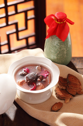 3、把全部原料和药材放入沙锅中,加入适量的水、盐、味精、鸡精,小火煲1-2小时即成。