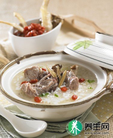 2、排骨洗净,氽烫,捞出冲净,加入糙米、姜片及6杯水,以大火烧开,转小火炖40分钟,待米糜肉熟即可加盐调味。