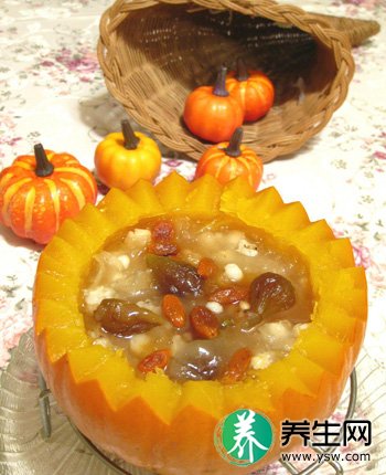 制作:先将银耳放在清水里泡发,洗净后在热水里汆烫一下,捞出沥干;南瓜洗净、去皮、切块,在蒸锅里蒸熟,摆在盘里;锅里放清水,放入冰糖并熬化、晾凉,再放上银耳;将冰糖汁淋在银耳南瓜上即成。