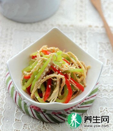 原料:新鲜海带丝200克,莴笋50克,鸡胸肉200克,青椒、红椒各少许,盐、味精、花椒油、白糖、香油各适量。