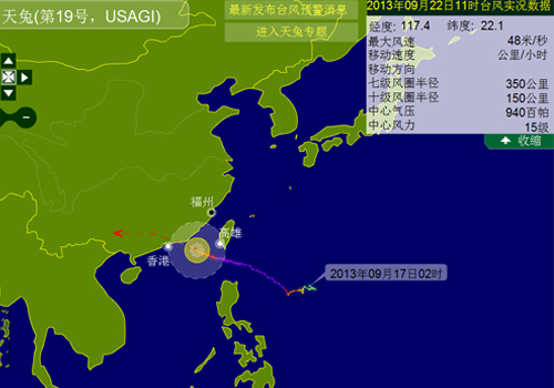 据监测,22~24日广东省有暴雨到大暴雨局部特大暴雨降水过程,21日夜间起广东省各市沿海和海面自东向西风力将逐渐加大到10~12级,随着“天兔”靠近风力还将继续加大。 最新天气趋势显示, 预计“天兔”将以20公里左右的时速向西偏北方向移动,趋向广东中部海面,将严重影响深圳。