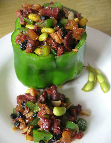 材料:卤驴肉200克、绿彩椒一个、蒜瓣四瓣、豆豉一勺、熟毛豆一把、花生油、生抽、香油