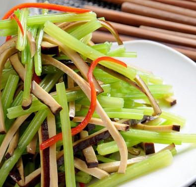 3、再放入芹菜、豆干及调味料拌炒3~4分钟即可。