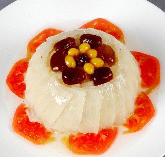 3、炒锅上火,滤入盘内汤汁,放清水100克,白糖150克和少许桂花汁烧沸,用水淀粉勾欠,起锅浇上山药上即成。