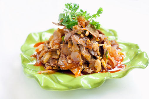 2.锅中热油,放牛肉、姜、葱炒变颜色后,加适量清水及料酒、酱油,再放入黑豆、莲藕,煮至牛肉熟烂。
