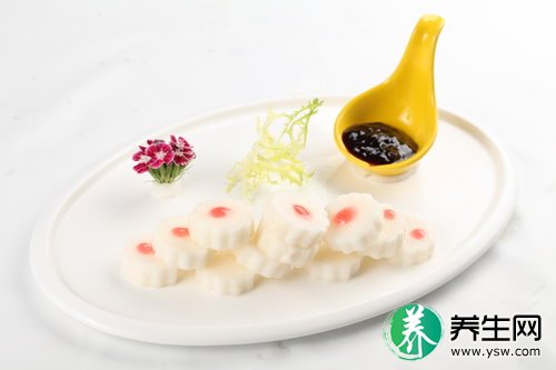 5、在山药泥中加入盐和淡奶油充分搅匀。将裱花嘴放入裱花袋中,再将山药泥放入,然后挤入杯中。最后,淋上蓝莓酱即可。