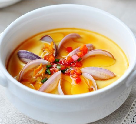 做法:1)准备原料。2)蛤蜊吐净沙子后,烧开水,放入蛤蜊,开口一个捞一个。蛤蜊全部捞出备用。3)鸡蛋充分打散,兑入等量的温开水。加入盐充分搅拌均匀。4)蛤蜊摆在炖盅内,或者碗里。5)滤网过滤蛋液入容器内。包上保鲜膜用牙签戳几个小洞,或者盖上蛋盅盖子。中小火蒸8分钟-10分钟即可。6)红椒,豉油,香油,兑好7)蒸好的蛋羹吃的时候淋上步骤6中的料汁即可。