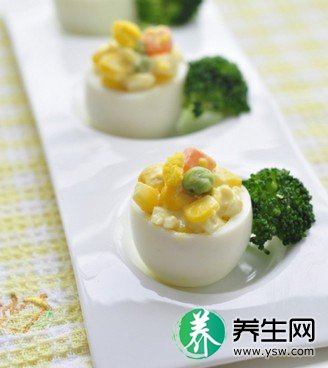 材料:鸡蛋、玉米粒、胡萝卜、豌豆、西兰沙拉酱
