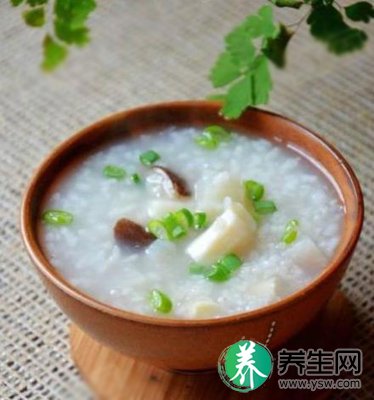 3、粳米淘洗干净,放入羊肉锅里,加进葱白煮成稀粥。加盐调味。供早、晚餐温热服食。