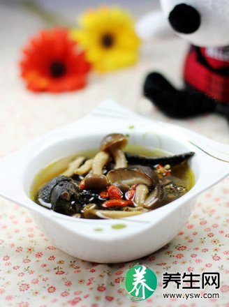 材料:乌鸡、蟹味菇、香菇、枸杞、食盐、葱、姜、八角、桂皮、料酒、香叶
