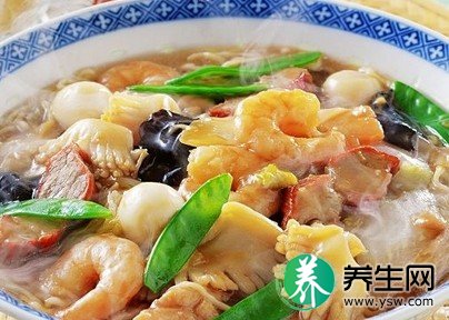 主料:面条(标准粉)500克、虾仁225克、海参50克、叉烧肉100克、豌豆苗150克。