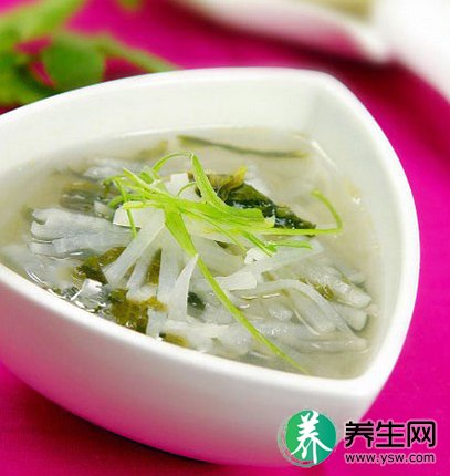 小贴士:这款食疗汤菜不是所有人都适宜,对于脾胃虚寒、风寒感冒的人士要谨慎少食,也可以将紫菜换成大葱叶,就做成萝卜丝葱叶汤,葱叶含有丰富的维生素C、维生素A及钙,对于预防感冒也是非常有帮助的,而且它丰富的辣素可以促进血液循环,姜片和大葱的温性可以平衡萝卜丝的微寒属性,可以用来预防风寒感冒。
