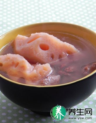 做法:莲藕洗净去皮,切大块,用盐腌30分钟。(作用是令莲藕的口感更粉糯);大排剁大块焯血水后洗净;大排和姜片放入汤中;.大火 煲开,去掉表面的浮沫(这个过程要耐心,一点点的去掉);等汤清澈后放入莲藕,大火煲开转小火2小时;吃时调入食盐即可。功效:润 肺清毒,防治贫血。
