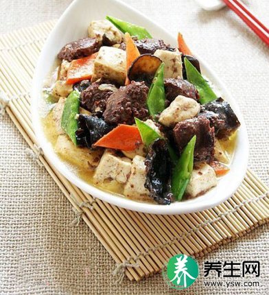 材料:猪血、豆腐、黑木耳、胡萝卜、荷兰豆、色拉油、食盐、鸡精、葱、姜、料酒、生抽、香油、水淀粉、水、五香粉