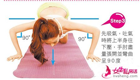 步骤3、先吸气,吐气时上半身往下压,手肘尽量张开并弯曲呈90度,让上臂与肩膀呈一条直线。