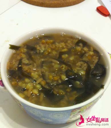 材料:绿豆100克 海带15克 清水1500ml 冰糖30克