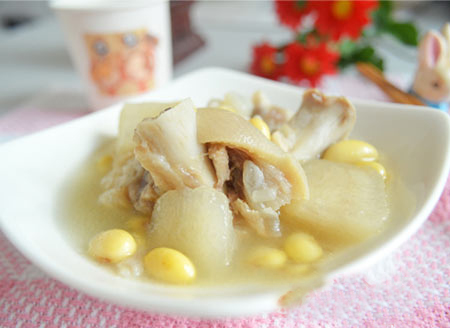 材料:猪手500克、黄豆100克、党参15克、黄芪15克、大枣10枚、通草20克、生姜片、盐适量。