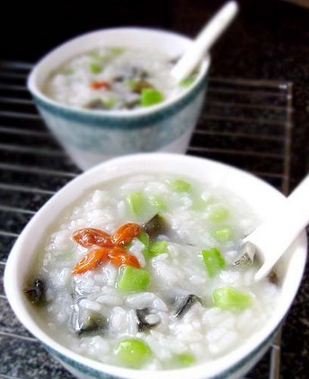 材料:大米,皮蛋,苦瓜 ,枸杞,冰糖。