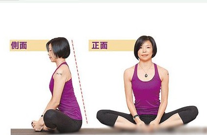 弯膝盖使脚掌相对,双手扶脚掌,背打直使脊椎往头顶延伸,缓缓吐气将上半身往前倾,使肚脐靠近脚掌。