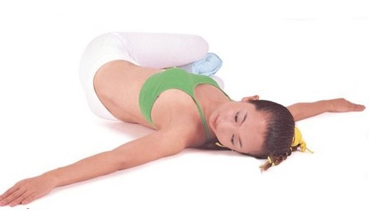 2、将两边膝盖尽可能靠近胸部,并向左侧倾倒。注意上上半身不动,扭动腰部,尽量保持肩膀贴着地面,身体平躺向上。脸面向和膝盖不同的方向。
