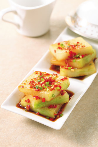 2、冬瓜片、西红柿片、黄瓜片装盘,浇上用盐、醋、味精、麻酱调料兑好的汁,拌匀即成。