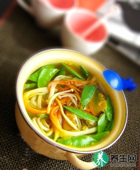 烹调方式:金针(干)30克、黄豆芽100克、青椒丝100克、木耳100克,将所有材料加4~5碗水烹煮。调味可自行添加或将高汤稀释调味。