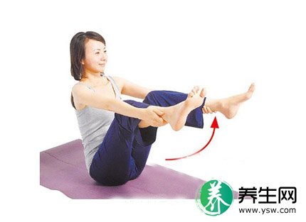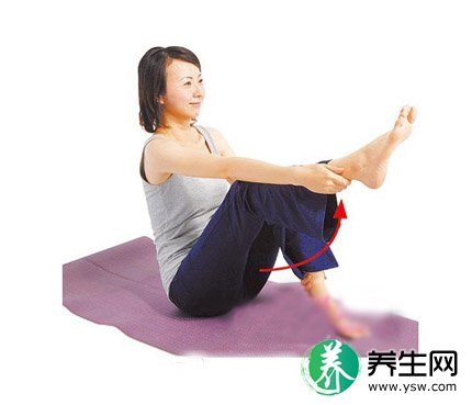 坐姿,屈膝,两手各自抓住两脚的脚尖或脚踝。将上半身后倾30度,吸气后吐气,举起右脚,使脚踝与膝盖同高。