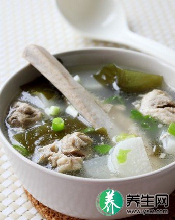 做法:把萝卜削皮切成小块,锅中的1500毫升水大火煮沸后先放萝卜、海带、姜片,待水再度滚时转成小火,直到萝卜、海带煮熟烂,最后加入用纱布包着的其他原料,再煮15分钟即可。每次午晚餐前先喝汤吃料,也可直接当减肥点心食用。