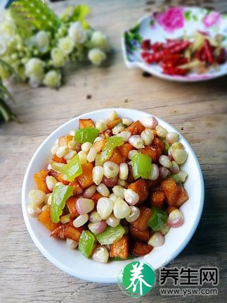 ③锅中留少许底油,下青椒丁和玉米粒略炒,再放入红薯丁翻炒,加入高汤、盐、鸡精、胡椒粉炒熟,下枸杞子炒匀,用水淀粉勾芡即可。