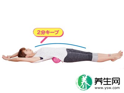 仰卧,将柱形枕横放在肚脐正对的腰部下方。两手举过头顶,伸直,深呼吸进行放松。