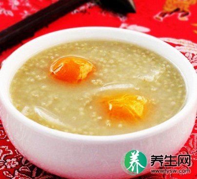 做法:山药去皮,切片,与金橘片及淘洗干净的小米一同入锅,加适量水,用大火煮开,改用小火熬成稠粥,加入白糖即成。