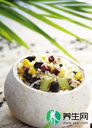 原料:椰皇、泰国香米、紫米、紫薯、玉米、红豆、蔬菜粒、鸡蛋。