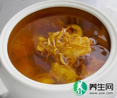 乌骨鸡1只,洗净切块,虫草、党参各10克,黄精、熟地各5克,纱布包好,一同入锅内,加玉兰片、冬菇、料酒、生姜、食盐、葱头等调料和适量清水,煨炖至酥烂即可食用,隔日一次。