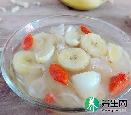 原料:干银耳15克,鲜百合120克,香蕉2根,枸杞5克,冰糖100克。