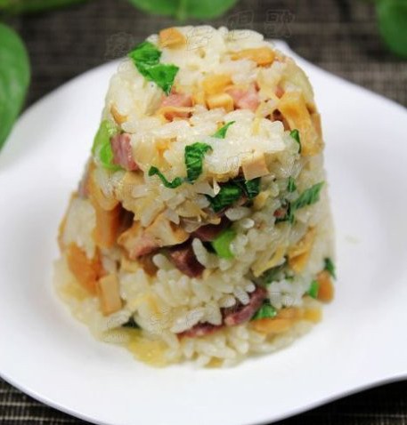 材料:干贝、咸肉、大米、豆腐干、洋葱、油菜苔、色拉油、食盐、生抽