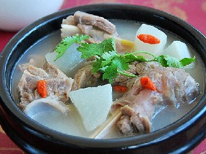 做法:取羊腿肉500克,洗净加黄酒、生姜片浸半小时,入油锅爆炒,倒入砂锅内,加水煮沸后用小火煨半小时;白萝卜切块,放水中煮沸后加入羊肉汤,放盐,用小火煨至萝卜羊肉均酥烂即可。