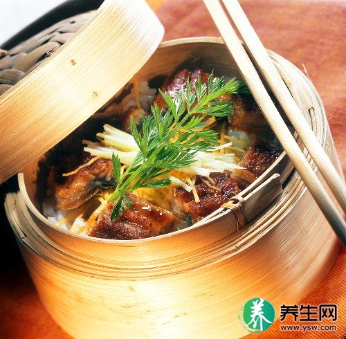 做法:鳗鱼宰净,切段,放开水锅中氽一下,捞出,用清水洗净;猪油(板油)切丁;火腿切末。盘中放鳗鱼,放入猪板油丁、火腿末、葱、姜、料酒、盐、味精、胡椒粉,上笼用旺火蒸20分钟取出,除去葱、姜即可。