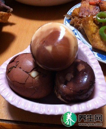 做法:把400克鸡蛋放在适量清水中煮上10分钟,去掉蛋壳,加入以酱油、料酒、红茶、桂皮、八角、白糖、葱、姜、盐制成的调料包和适量清水,烧沸后,再以中火稍10分钟。