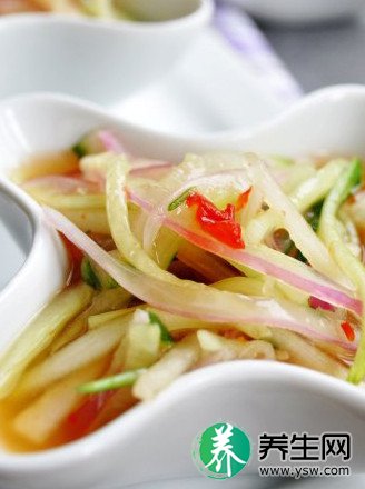 4、将洋葱丝从水里捞出来稍微控下水,这时候洋葱的辛辣味已经基本去掉了,再将梨丝和黄瓜丝拌在一起,放入盐,泰式甜辣酱,醯官醋,将蒜头拍扁稍微切几下也放进去,拌匀之后腌制十来分钟即可