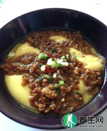 猪肉味甘咸,性平,具有滋阴润燥功效。鸡蛋有养心安神、补血、滋阴润燥的作用。将猪肉末装碗,加入食盐、酱油、料酒、姜末、色拉油和少许水搅拌均匀,倒入汤盆内。再把鸡蛋打在肉末上,撒上葱花,然后蒸制,待肉末、鸡蛋煮熟,取出即为成品。酱油、食盐用量不宜过多。肉末必须搅拌到有黏性。控制蒸制时间,避免蒸制过长,肉质过硬。
