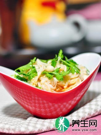 材料:金针菇、食盐、香油、香菜、花椒油、辣椒油、白糖